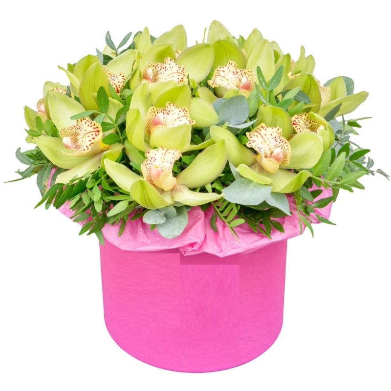 Букет из орхидей в коробке с зеленью