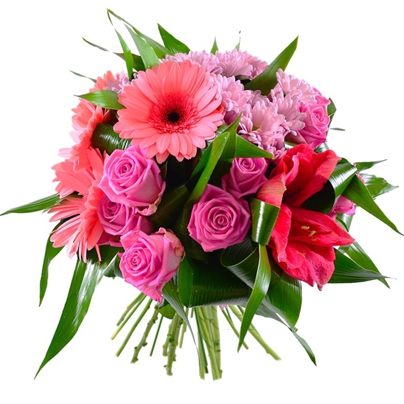 Букет состоит из 7 роз, 4 гербера, 1 амариллис, 4 ветки кустовой хризантемы, зелень, прозрачная упаковка, атласная лента.