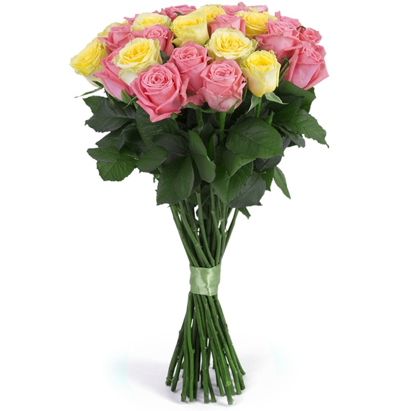 Букет состоит из 20 розовых роз, 11 желтых роз, прозрачная упаковка, атласная лента.